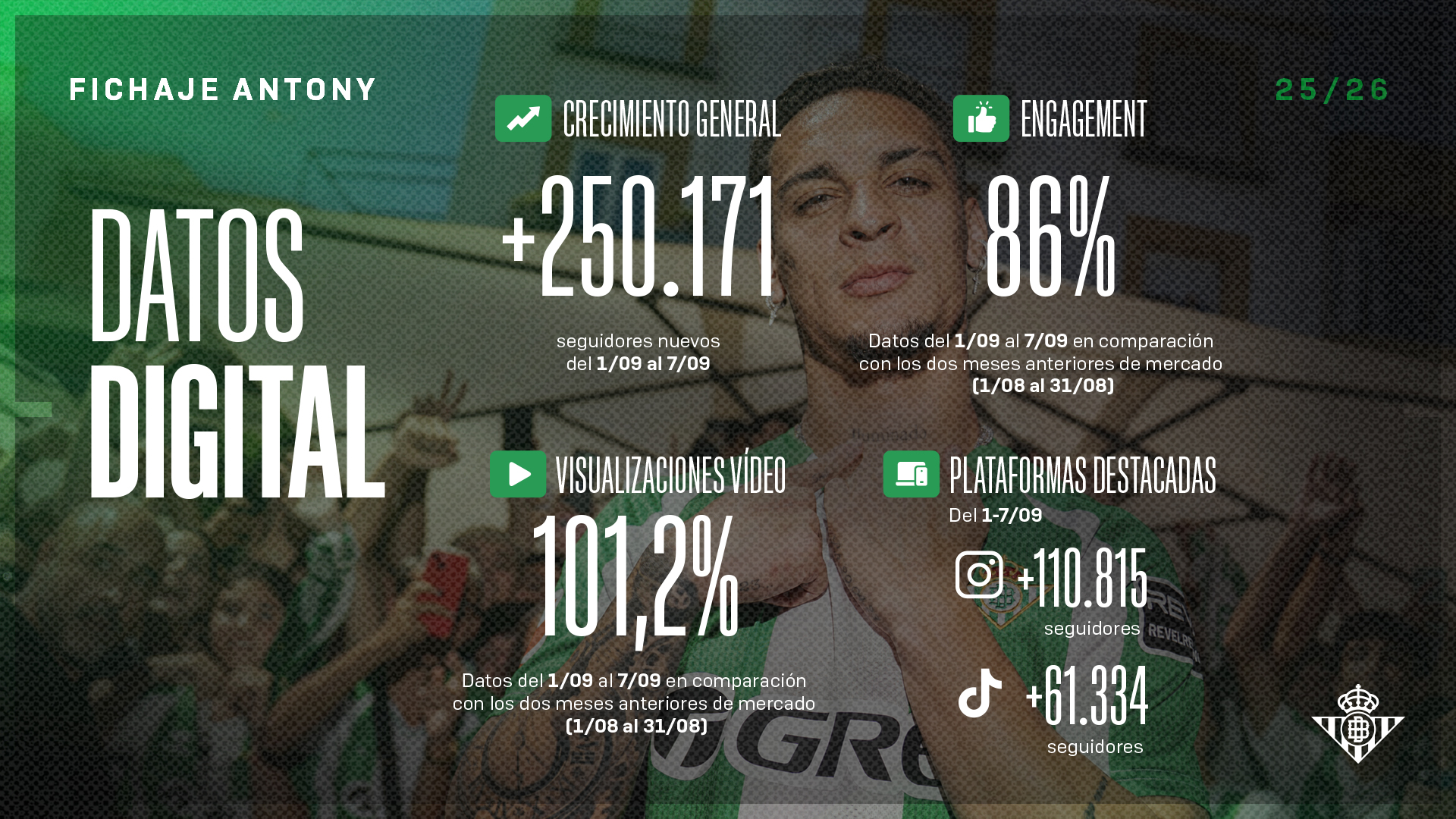 La incorporación del brasileño impulsó el crecimiento digital del Real Betis con 250.000 nuevos seguidores, alcanzando sólo en una semana casi el mismo número de interacciones o engagement que en los dos meses anteriores del mercado de fichajes, con Instagram y TikTok como plataformas destacadas