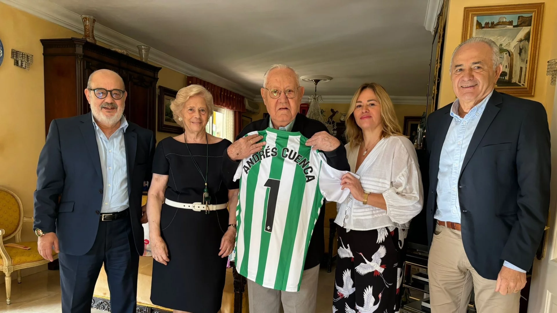 Rafael Gordillo y una representación de nuestra entidad visitaron en su domicilio a tan veterano aficionado bético, haciéndole entrega de una camiseta conmemorativa